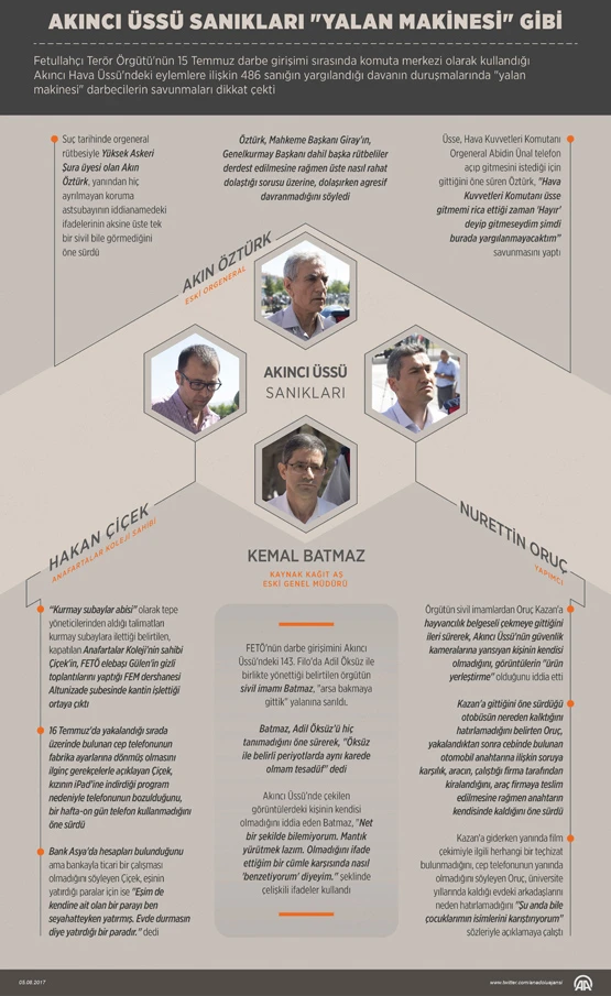Fetullahçı Terör Örgütü'nün (FETÖ) 15 Temmuz 2016'daki darbe girişimi sırasında komuta merkezi olarak kullandığı Akıncı Hava Üssü'ndeki eylemlere ilişkin davanın duruşmalarında "yalan makinesi" darbecilerin savunmaları dikkati çekti.