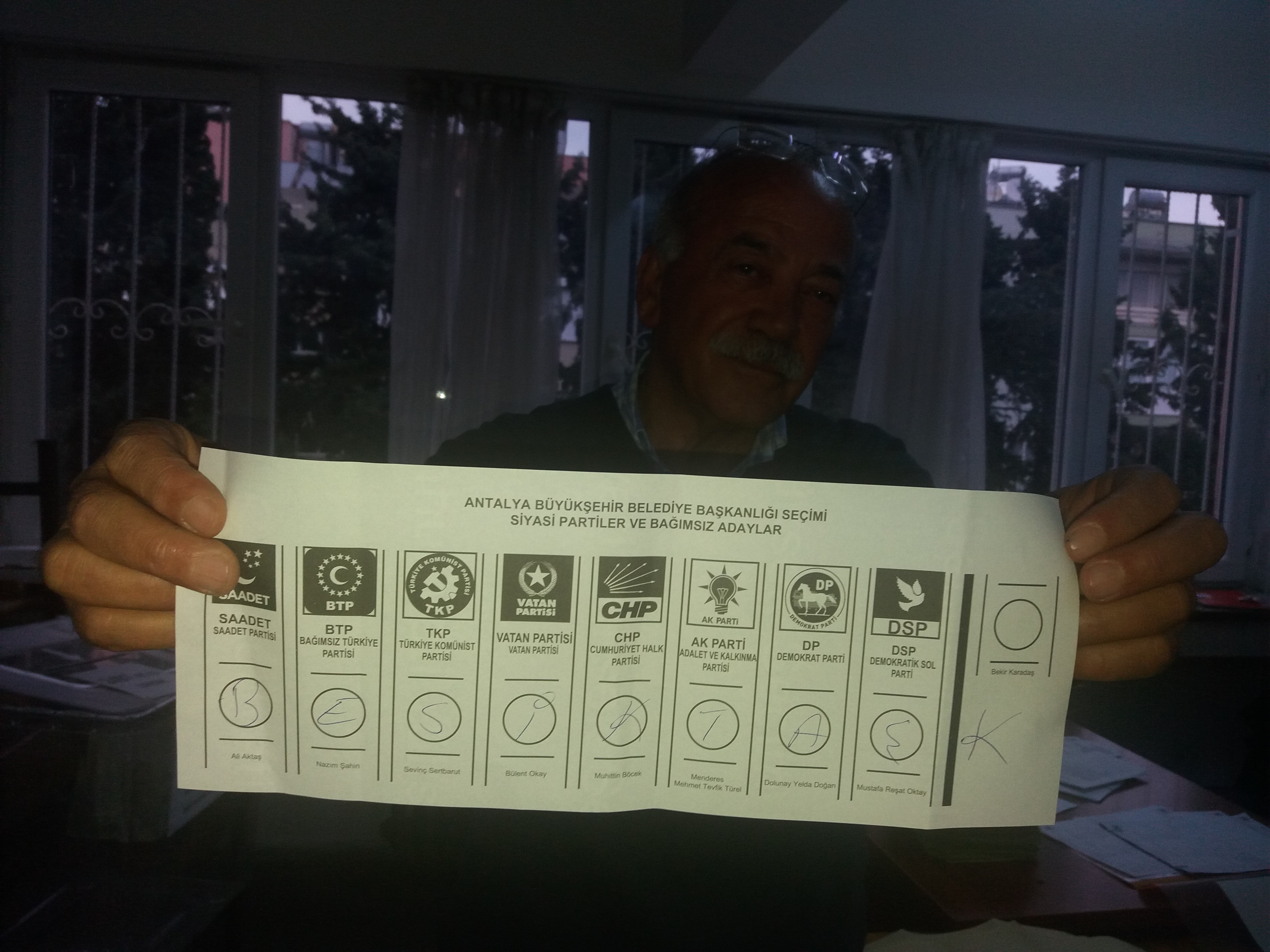 Antalya'da 1 milyon 708 bin seçmenin 5 bin 457 sandıkta oylarını kullanmasının ardından sandıklardan ilginç bir oy pusulası daha çıktı. Muratpaşa ilçesindeki Merkez Ortaokulunda 2497 nolu sandıkta bir seçmenin Büyükşehir Belediyesi adayları kısmına "BEŞİKTAŞK" yazarak oy kullanılması ve oyun sandık kurulu tarafından geçersiz sayılmasının ardından ikinci vaka Alanya'da yaşandı.