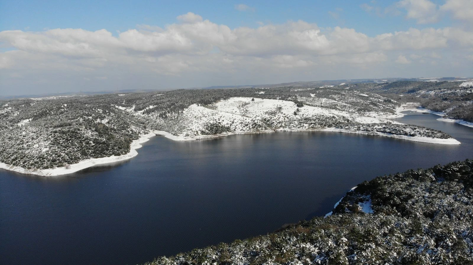 Yağan karların da erimesiyle ilerleyen günlerde su seviyesinin daha da yükselmesi beklenirken, kar yağışı sonrası su seviyesinin yüzde 34 olduğu Alibey Barajı drone ile havadan görüntülendi.