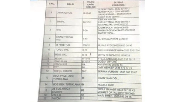 Aygün'e gönderilen, "Birlik, Telsiz çağrı kodları, İrtibat personeli başlıkların yer aldığı" listede birlik ve irtibat personeli olarak gösterilen Tuğgeneral rütbesindeki şüphelilerin atamasının da sözde sıkıyönetim atama listesine göre saat 22.30'da gerçekleştiğine dikkat çekildi. Buna göre, Topçu ve Füze Okul Komutanlığı ve 58. Topçu Tugay Komutanlığı'na Murat Aygün'ün, Mamak 28 Mekanize Piyade Tugayı'na Ali Kalyoncu, Etimesgut Zırhlı Birlikler Komutanlığı'na Ahmet Bican Kırker, Kara Kuvvetleri Komutanlığı Kurmay Başkanlığı'na Lütfi İhsan Yanıkoğlu'un isimlerine yer verildiği görülüyor.