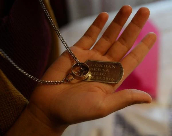 Berna Kılıç, eşinin alyansını ve isimlerinin yazılı olduğu künye şeklinde kolyeyi göstererek gözyaşlarına boğuldu.