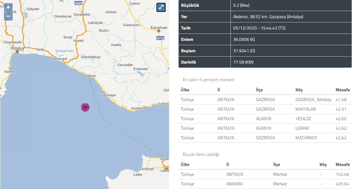 Afet ve Acil Durum Yönetimi Başkanlığının (AFAD) internet sitesinde yer alan bilgiye göre, saat 15.44'te Gazipaşa ilçesi açıklarında 5,2 büyüklüğünde sarsıntı kaydedildi.