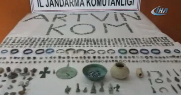 Alınan bilgiye göre, Artvin İl Jandarma Komutanlığı Kaçakçılık ve Organize Suçlarla Mücadele (KOM) ekipleri, Konya-Hopa seferini yapan bir yolcu otobüsünde Hopa ilçesi girişinde arama yaptı. Aramada İ.S, E.P. ve M.N. isimli yolculara ait valizlerde farklı dönemlere ait bin 293 adet altın, bronz veya gümüş olduğu değerlendirilen sikke, 7 adet bronz veya gümüş olduğu değerlendirilen küçük insan ve hayvan heykelleri, 92 adet altın, bronz veya gümüş olduğu değerlendirilen yüzük, 87 adet takı ve süs eşyası, 45 adet cam ve taş olduğu değerlendirilen takı ve süs eşyası, 3 adet kolye, 7 adet altın, bronz veya gümüş olduğu değerlendirilen bilezik ile çeşitli parçalarla birlikte toplam bin 558 parça tarihi eser niteliğinde obje ele geçirildi. Şüpheli 3 şahıs gözaltına alınırken, olayla ilgili inceleme sürüyor.