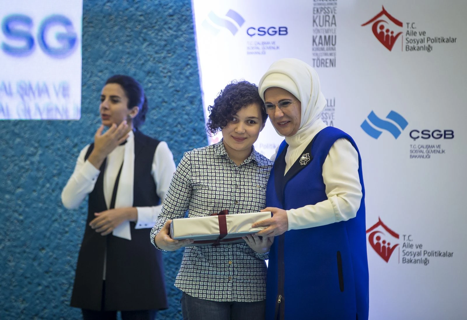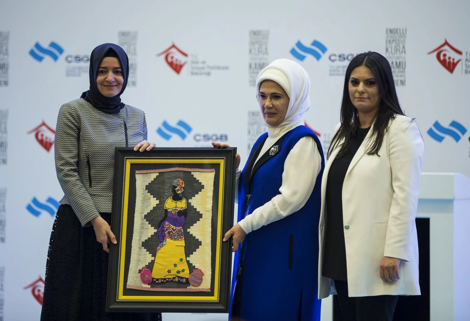 Daha sonra, Çalışma ve Sosyal Güvenlik Bakanı Jülide Sarıeroğlu ile Aile ve Sosyal Politikalar Bakanı Fatma Betül Sayan Kaya, Emine Erdoğan'a tablo armağan etti.