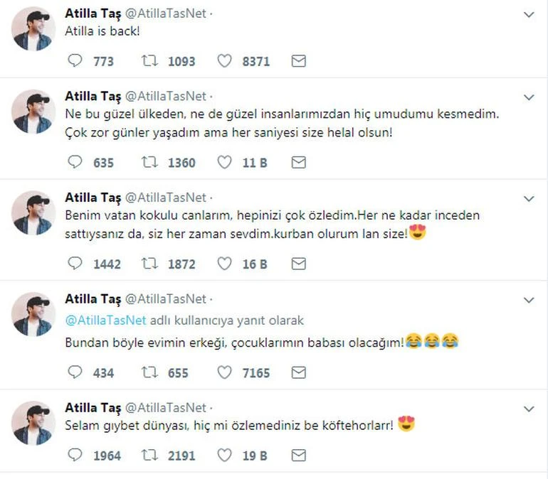 FETÖ’nün ‘medya yapılanması’na üyesi olduğu iddiasıyla tutuklu yargılanan Atilla Taş dün tahliye oldu. Taş, bugün 1,5 milyon takipçisi olan sosyal medya hesabından ilk mesajını paylaştı.