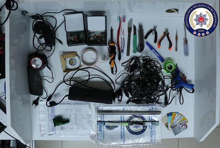 Ekipler, çevrede yaptıkları araştırmada şüphelinin suç ortağı olduğu iddiasıyla M.E.’yi de gözaltına aldı. Şüphelilerin günü birlik kiraladıkları evde ve otomobilde yapılan aramada, dolandırıcılıkta kullanılan 2 bilgisayar, 1 kart yazma makinesi ve adaptörü, 1 kart yazma programı, 16 gizli kamera düzeneklerinden veri aktarılmasını sağlayan kablo, 6 gizli kamera düzeneği devresi, 4 batarya ile düzenek hazırlamada kullanılan silikon tabancası, çift taraflı bant, 2 yapıştırıcı, lehim tabancası ve lehim ele geçirildi. Şüphelilerin Adana’da yaşadıklarını belirleyen ekipler, Ankara, İzmir, İstanbul, Denizli, Kayseri, Elazığ, Antalya ve İçel’de aynı yöntemle 35 kişinin kart bilgilerini kopyalayıp, hesaplarından 90 bin lira çektiklerini tespit etti.