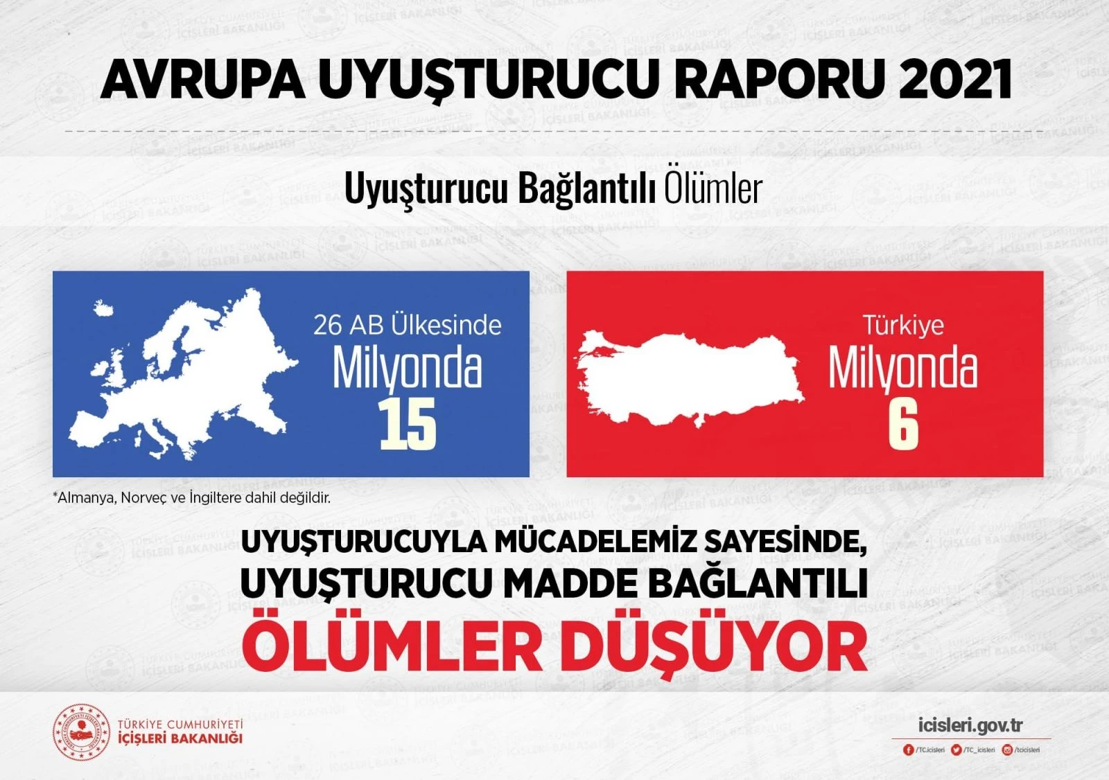 İçişleri Bakanı Süleyman Soylu, sosyal medya hesabından 27 Avrupa Birliği (AB) ülkesinde ve Türkiye’de uyuşturucu bağlantılı ölümlerin ve hayatında en az bir kez uyuşturucu madde kullanan kişi sayısına ait verilen yer aldığı “Avrupa Uyuşturucu Raporu 2021” tablolarını paylaştı. Söz konusu tablonun ilkinde Almanya, Norveç ve İngiltere hariç 26 AB üyesi ülke ile Türkiye’deki uyuşturucu bağlantılı ölümlerin verileri yer aldı. 26 AB ülkesinde uyuşturucu bağlantılı ölümlerin sayısı milyonda 15 iken, Türkiye’de bu sayının milyonda 6 olduğu belirtildi. Tabloda ayrıca, “Uyuşturucuyla mücadelemiz sayesinde uyuşturucu madde bağlantılı ölümler düşüyor” ifadelerine yer verildi.