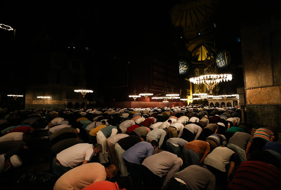 Akşam ve yatsı ezanıyla birlikte çok sayıda vatandaş, namaz için Ayasofya-i Kebir Camii'nde yerini aldı.