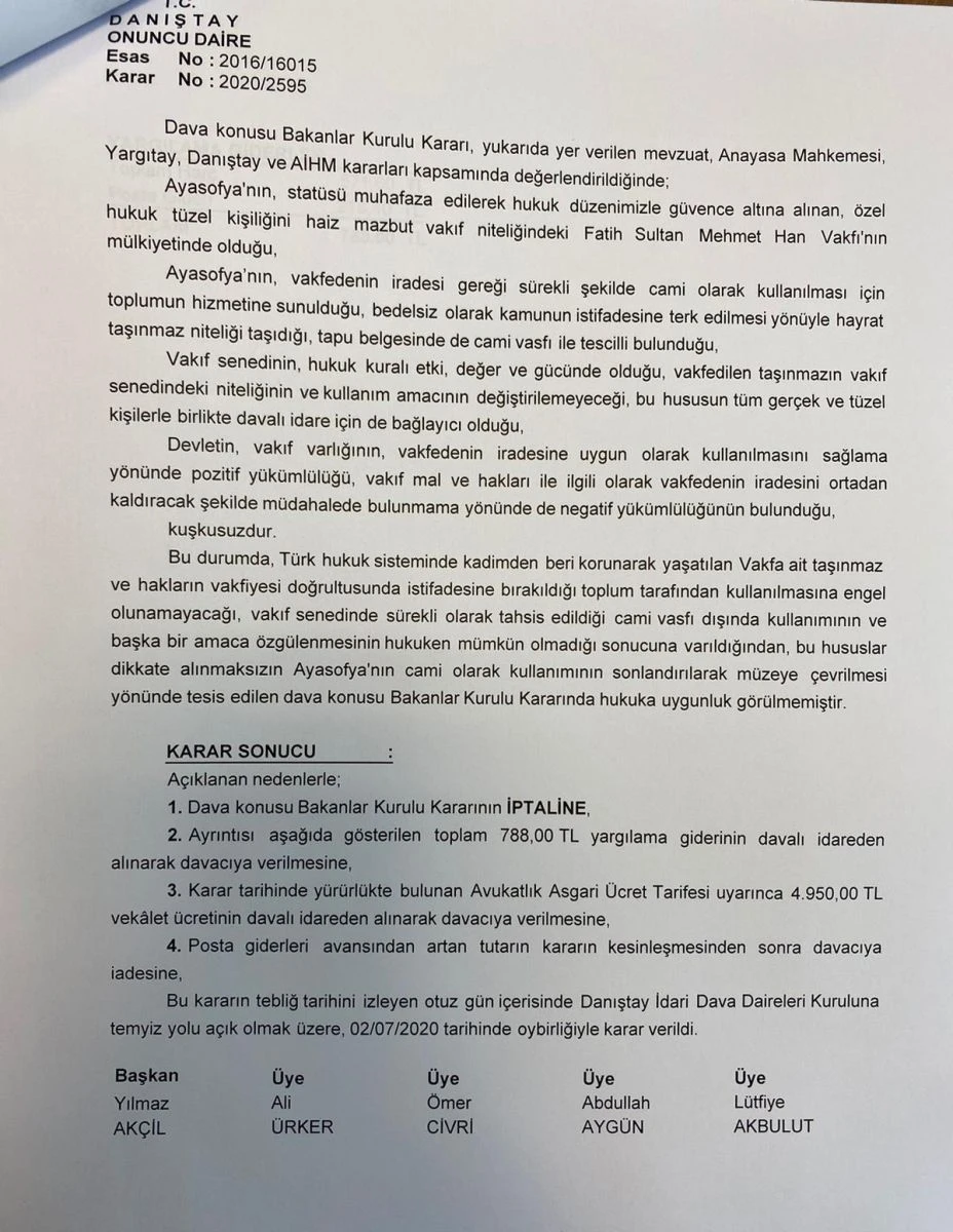 Daire, Ayasofya'nın camiden müzeye dönüştürülmesine dair 24 Kasım 1934 tarihli Bakanlar Kurulu kararını iptal etti.