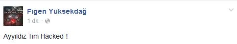 Figen Yüksekdağ'ın Facebook sayfasını hackleyen Ayyıldız Tim, Figen Yüksekdağ adıyla kendi imzalarını atarak 'Tüm polislerimize, askerlerimize ve şehit ailelerimize selam olsun, bu sayfa sizlere armağan olsun' yazısı paylaştılar. Ayrıca, 'Sizler vatan hainisiniz, şehit çocuklarının ahı sizleri boğacak' yazısı da bir diğer dikkat çeken gönderi oldu.