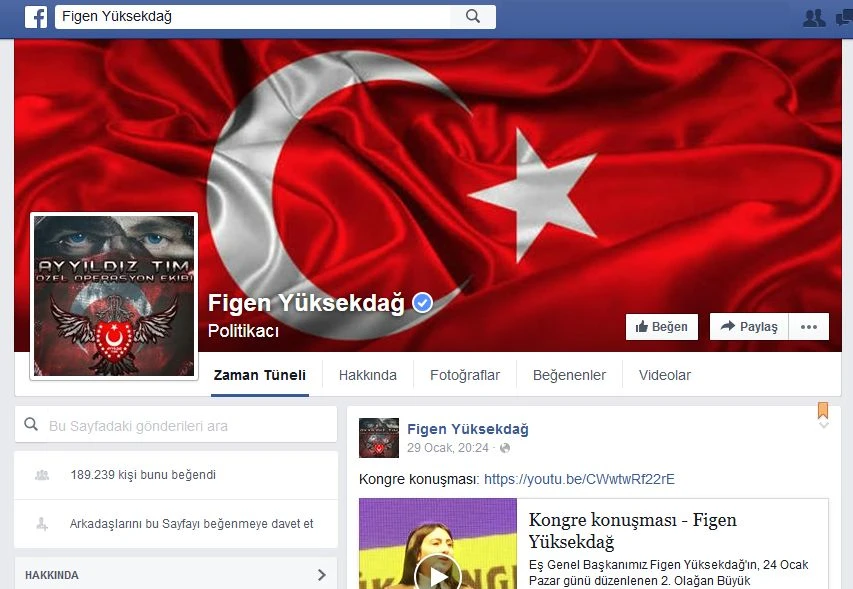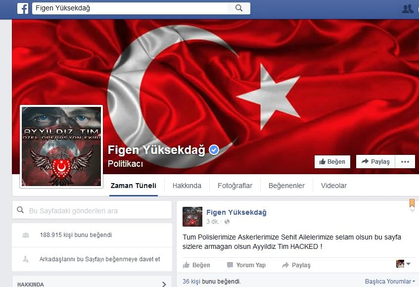Facebook'un tanınmış kişilere ve büyük kuruluşlara verdiği onay tiki olan Figen Yüksekdağ'ın sayfasını Ayyıldız Tim ele geçirdi. Olayın detaylarına TGRT Haber'den Semih Bişkin ulaştı. Ayyıldız Tim, Salı günü, gündüz saatlerinde başta Amedspor'un fan ve büyük sayfası olmak üzere bir çok terör destekçisi sayfaya siber saldırı düzenleyerek ele geçirmişti. Ayyıldız Tim ekibi ise geceyi büyük bir bombayla sonlandırdı. Figen Yüksekdağ'ın Facebook tarafından resmi olarak onayladığı ve mavi tik verdiği sayfası Ayyıldız Tim tarafından hacklendi.