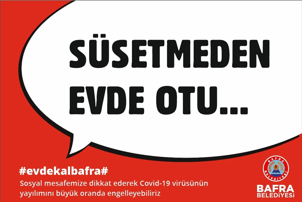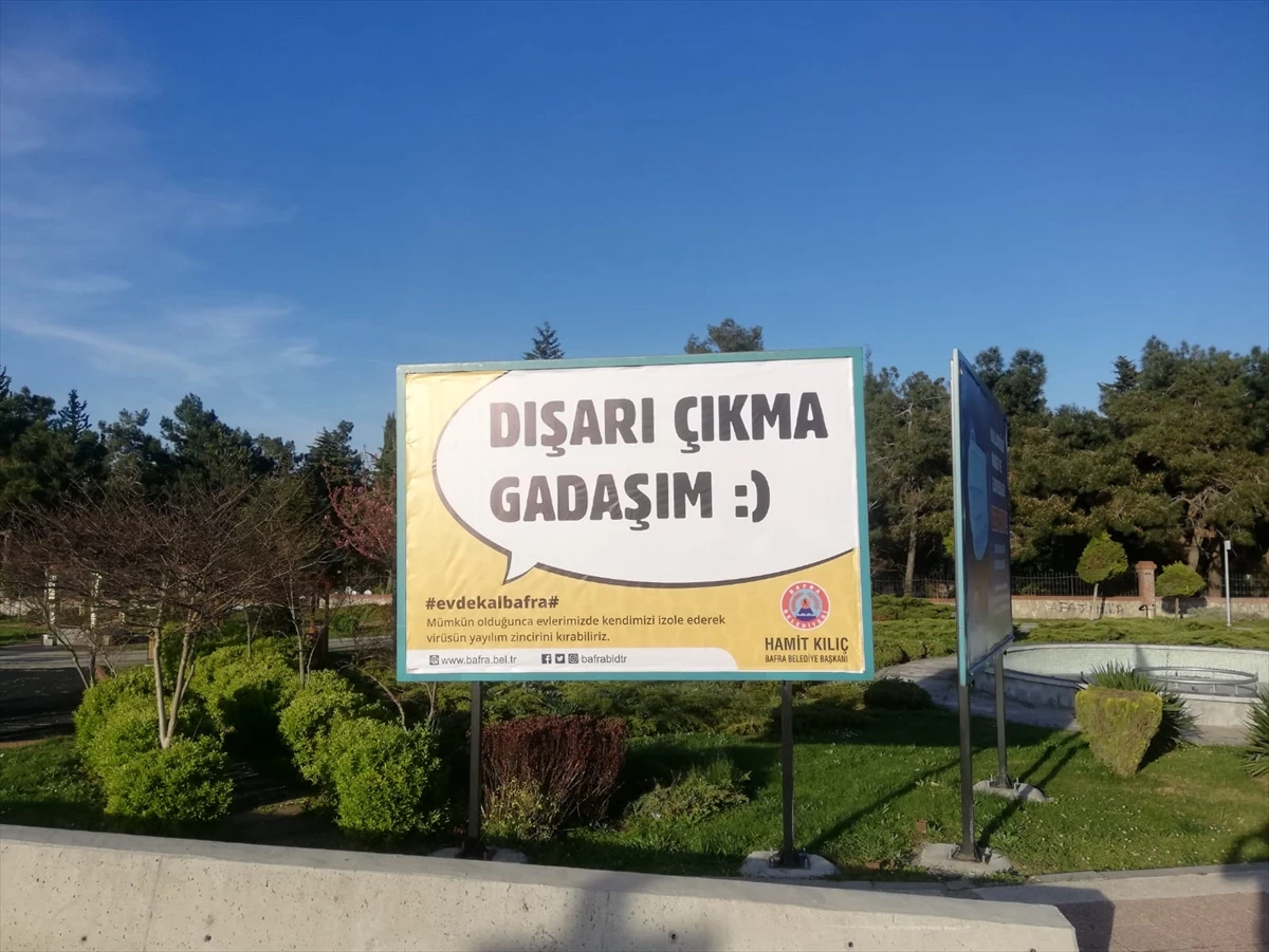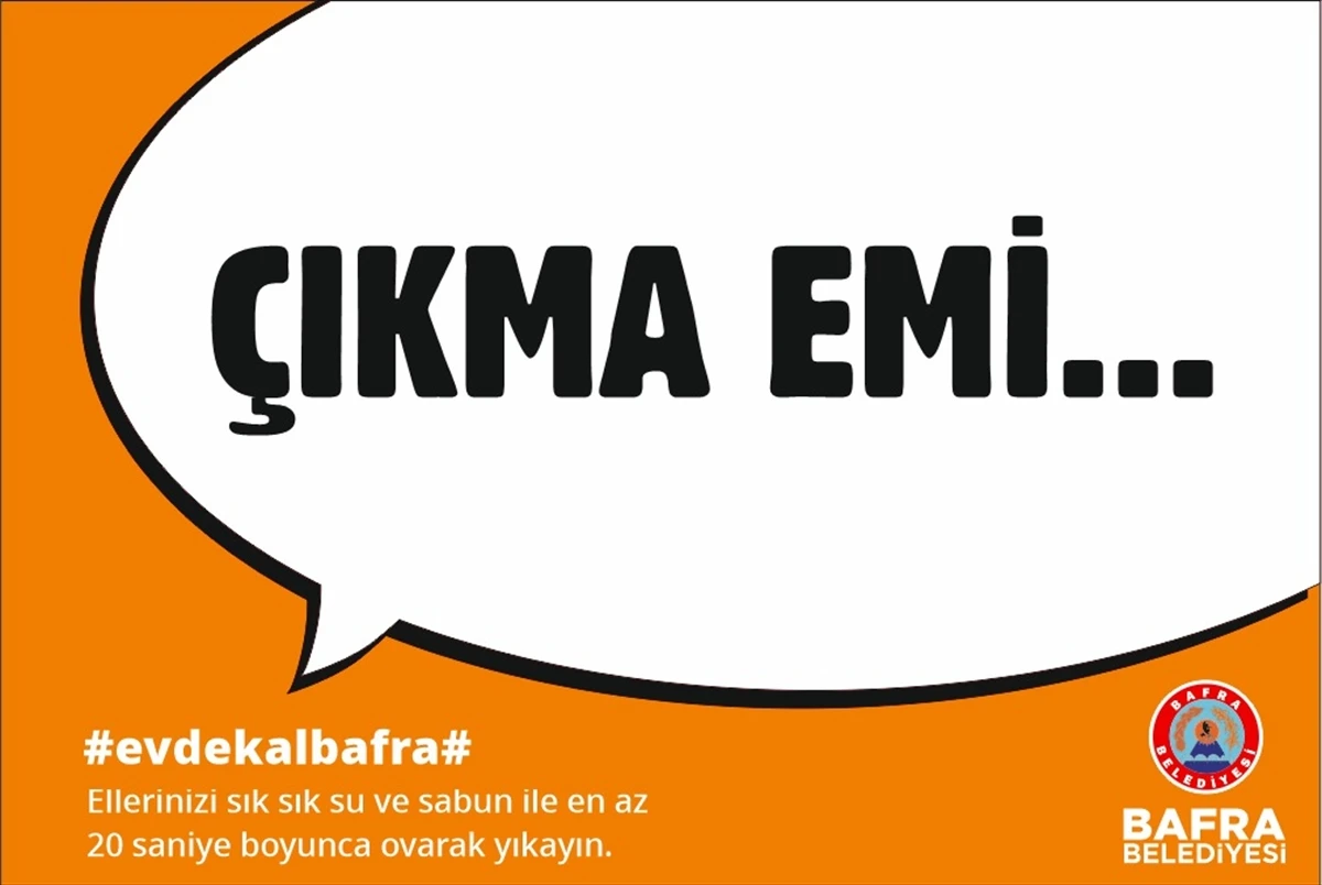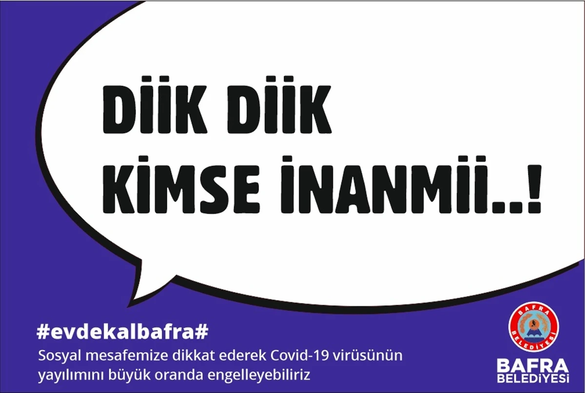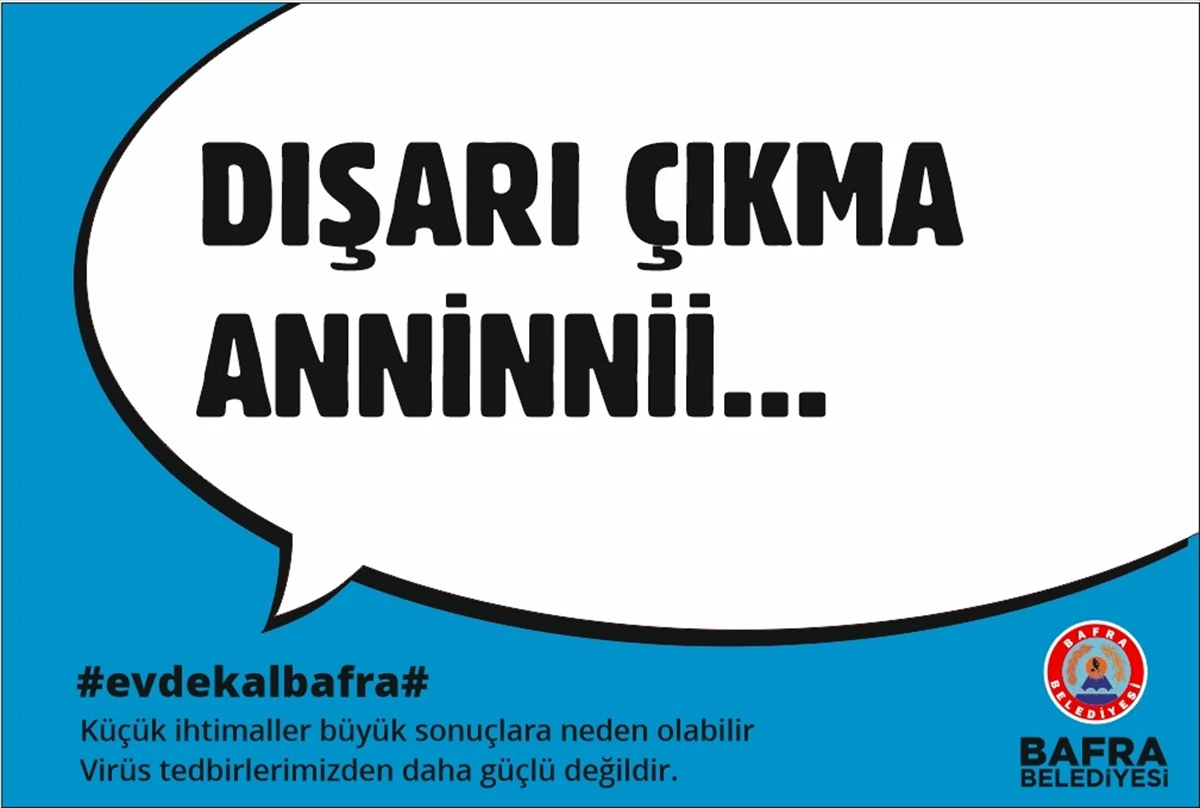 Afişlerde, "Dışarı çıkma gadaşım", "Goca Bafralı saa diim saa evde gal", "Dışarı çıkmican bilindaa", "Çıkma emi" uyarıları yer alıyor.