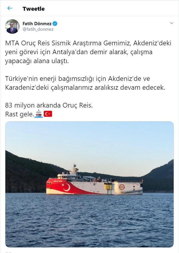 "MTA Oruç Reis Sismik Araştırma Gemimiz, Akdeniz’deki yeni görevi için Antalya’dan demir alarak, çalışma yapacağı alana ulaştı. Türkiye’nin enerji bağımsızlığı için Akdeniz’de ve Karadeniz’deki çalışmalarımız aralıksız devam edecek. 83 milyon arkanda Oruç Reis. Rast gele."