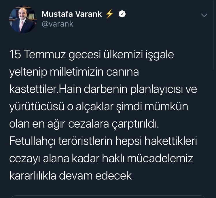 Sanayi ve Teknoloji Bakanı Mustafa Varank, 15 Temmuz hain darbe girişimini yöneten “Yurtta Sulh Konseyi” üyelerinin aralarında bulunduğu 224 sanığın yargılandığı çatı davasının karara bağlanmasının ardından sosyal medya hesabından bir değerlendirme yaptı.