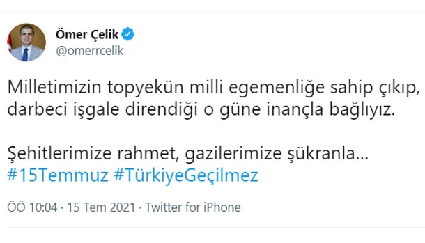 AK Parti Sözcüsü Ömer Çelik, 15 Temmuz Demokrasi ve Milli Birlik Günü nedeniyle sosyal medya hesabından paylaşım yaptı.