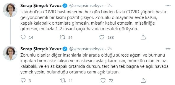 Serap Şimşek Yavuz’un açıklamaları şu şekilde:"İstanbul'da COVID hastanelerine her gün binden fazla COVID şüpheli hasta geliyor,önemli bir kısmı pozitif çıkıyor. Zorunlu olmayanlar evde kalsın, kapalı-kalabalık ortamlara girmesin, misafir kabul etmesin, misafirliğe gitmesin, en fazla 1-2 insanla,açık havada,mesafeli görüşsün.