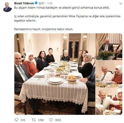 Yıldırım sosyal medya hesabı üzerinden "Bu akşam Adem Yılmaz kardeşim ve ailesini gönül soframıza konuk ettik. İç ısıtan sohbetiyle, gecemizi şenlendiren Mine Teyzeme ve diğer aile üyelerimize teşekkür ederim. Ramazanımız hayırlı, oruçlarımız kabul olsun." ifadesine yer verdi.