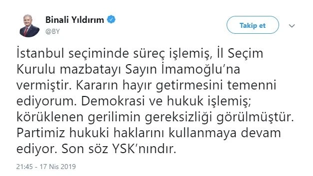 "İstanbul seçiminde süreç işlemiş, İl Seçim Kurulu mazbatayı Sayın İmamoğlu’na vermiştir. Kararın hayır getirmesini temenni ediyorum. Demokrasi ve hukuk işlemiş; körüklenen gerilimin gereksizliği görülmüştür. Partimiz hukuki haklarını kullanmaya devam ediyor. Son söz YSK’nındır."