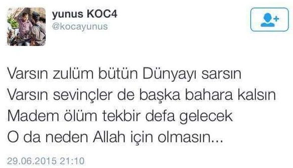 Bugün, Diyarbakır'daki bir eczaneye gelen teröristler tarafından ateş açıldı. Saldırıda eczanenin sahibi olan AK Parti Gençlik Kolları eski Başkanı Yunus Koca hayatını kaybetti.Güvenlik güçlerince olayın ardından kaçan kişi veya kişilerin yakalanması için çalışma başlatıldı. Geçen yıl AK Parti Diyarbakır Gençlik Kolları İl Başkanlığı'ndan ayrılan Koca'nın, 7 Haziran seçimlerinde kentten milletvekili aday adayı olduğu öğrenildi. Yunus Koca'nın yaşamını yitirmesinin ardından sosyal paylaşım mecralarında binlerce kullanıcı terörü lanetleyen paylaşımlarda bulunurken, Koca'nın ölmeden önce attığı tweetler de paylaşım rekorları kırdı.
