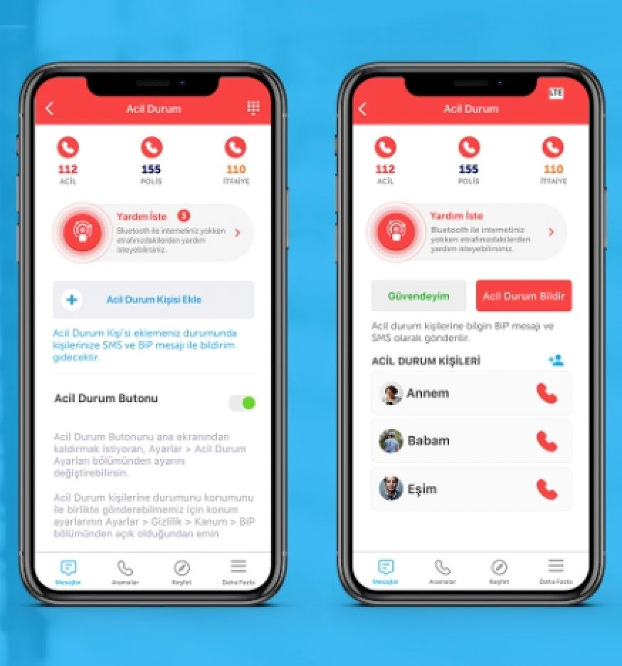 Türk mühendislerinin deprem ve diğer doğal afetler ile acil durumlarda hızlı, kolay ve kesintisiz iletişim imkânı sunmak için geliştirdiği ‘Acil Durum Butonu', tüm operatör kullanıcılarının daha önce belirlemiş olduğu yakınlarına tek tuşla güvende ya da acil yardıma muhtaç olduklarını konumlarıyla birlikte hem BiP hem de SMS ile iletmelerini sağlıyor. Aralık 2019'dan bu yana BiP ‘Acil Durum Butonu' ile “Acil Durumda Ulaşılacak Kişi” sayısı ise 2 milyona ulaştı. Kullanıcılar Acil Durum Butonu ile ayrıca 112 Acil Servis, 155 Polis ve 184 SABİM'e de direkt erişebiliyor.