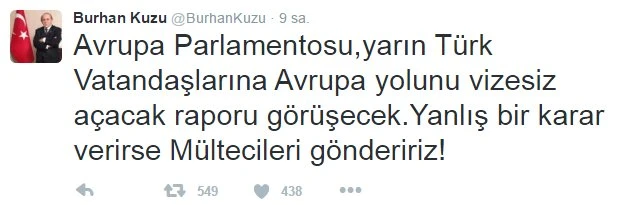 Avrupa Parlamentosu'nun konuyu yarın görüşeceğini belirten Kuzu, "Avrupa Parlamentosu, yarın Türk vatandaşlarına Avrupa yolunu vizesiz açacak raporu görüşecek. Yanlış bir karar verirse mültecileri göndeririz" ifadelerini kullandı.