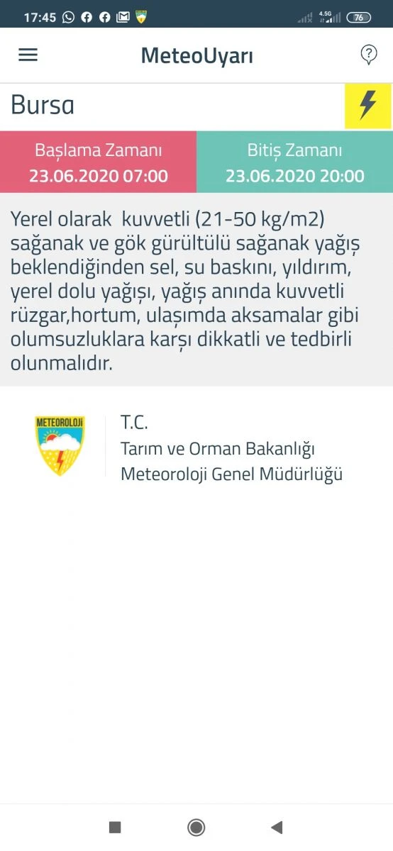 Meteoroloji Genel Müdürlüğünden yapılan açıklamada, "Yerel olarak kuvvetli (21-50 kg/m2) sağanak ve gök gürültülü sağanak yağış beklendiğinden sel, su baskını, yıldırım, yerel dolu yağışı, yağış anında kuvvetli rüzgar, ulaşımda aksamalar gibi olumsuzluklara karşı dikkatli ve tedbirli olunmalıdır" denildi.