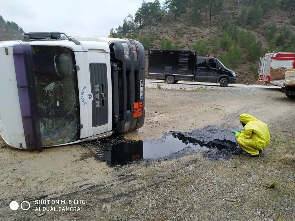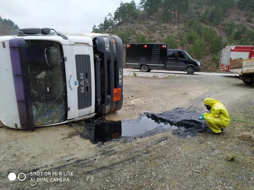 Edinilen bilgiye göre, sülfirik asit yüklü tanker, yoldan çıkarak yan yattı. Tankerdeki kimyasal maddeler yola döküldü.