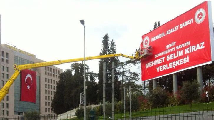 Çağlayan'da bulunan İstanbul Adalet Sarayı'nın ismi 31 Mart günü örgüt üyeleri tarafından rehin alınan Savcı Kiraz'ın anısına değiştirildi. Adliyenin D-100 Karayolu'na bakan tabelası akşam saatlerinde vinç yardımıyla iki işçi tarafından değiştirildi. Daha önce "Avrupa'nın En Büyük Adalet Sarayı" yazısının bulunduğu dev tabela üzerinde bu kez "Şehit Cumhuriyet Savcısı Mehmet Selim Kiraz Yerleşkesi" yazısı yer aldı. Başbakan Ahmet Davutoğlu, olayın ardından Eyüp Hükümet Konağı'nda yaptığı açıklamada, terör saldırısında şehit düşen Cumhuriyet Savcısı Mehmet Selim Kiraz'ın adının İstanbul Adalet Sarayı'na verileceğini açıklamıştı. 31 Mart günü meydana gelen olayda, 2 terörist Cumhuriyet Savcısı Mehmet Selim Kiraz'ı adliyedeki odasında rehin almış, 8 saat süren görüşmelerin ardından yapılan operasyon sırasında Savcı Kiraz şehit olurken, 2 terörist de öldürülmüştü.
