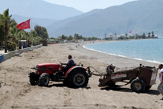 Foça Mahallesi'ndeki plaj, Çalış Turizm Tanıtma Derneği ekipleri tarafından traktöre bağlanan taş toplama ve kum eleme aracıyla temizlendi.