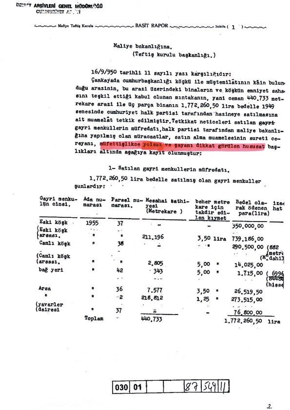 Habertürk yazarı Murat Bardakçı, Başbakanlık’a bağlı Devlet Arşivleri Genel Müdürlüğü’nün Cumhuriyet Arşivi kısmında bulunan 30-1-0-0-87-549-11 numaralı ve “Cumhurbaşkanlığı Köşkü’nün Bulunduğu Arazi ve Çevresinin 1949 Senesinde CHP’den Hazine’ye Satıldığına Dair Muamelât” başlıklı belgeyi yayınladı.