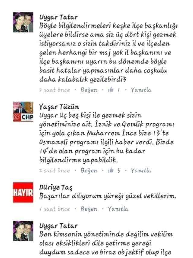 Bunun üzerine CHP Bilecik Milletvekili Yaşar Tüzün ise Uygar Tatar'a cevap vererek, "Uygar üç, beş kişiyle gezmek sizin yönetiminize ait. İznik ve Gemlik programı için yola çıkan Muharrem İnce bize saat 13.00'te Osmaneli programıyla ilgili haber verdi. Biz de saat 14.00'te olan program için bu kadar bilgilendirme yapabildik" ifadelerini kullandı.