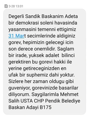 CHP’li adayın seçimden bir gün önce gönderdiği başka bir mesajda ise “Değerli sandık başkanım. 31 Mart seçimlerinde aldığınız görev hepimizin geleceği için çok önemlidir. Sizlere her zaman olduğu gibi güveniyor, görevinizde başarılar diliyorum” dediği görüldü.