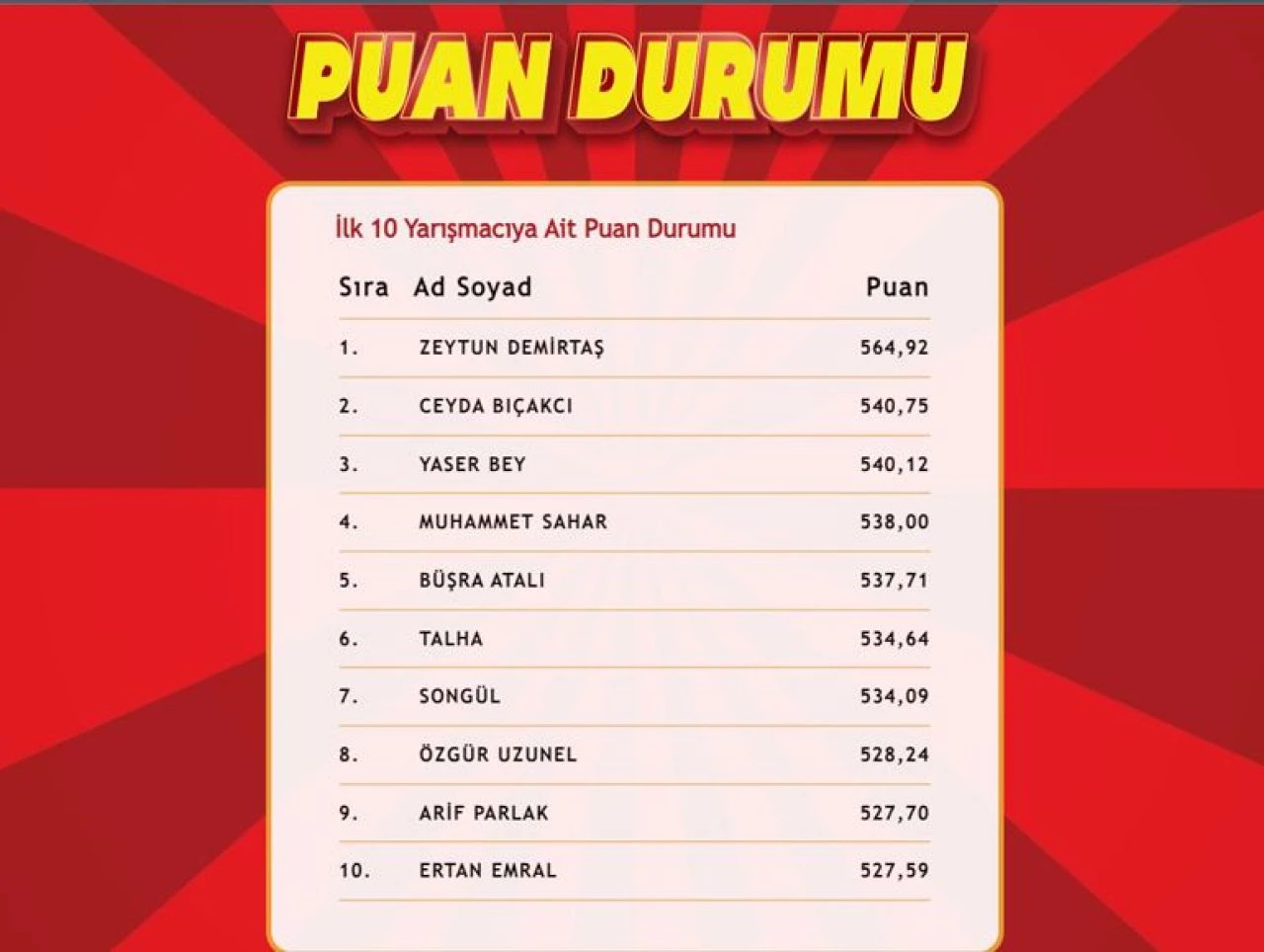 ” programına katılan yarışmacılar arasında birinci olan ve ilk on sıraya giren isimlerin listesiyle birlikte cevap anahtarları da  tgrthaber.com ve sosyal medya hesaplarımızdan paylaşılıyor.