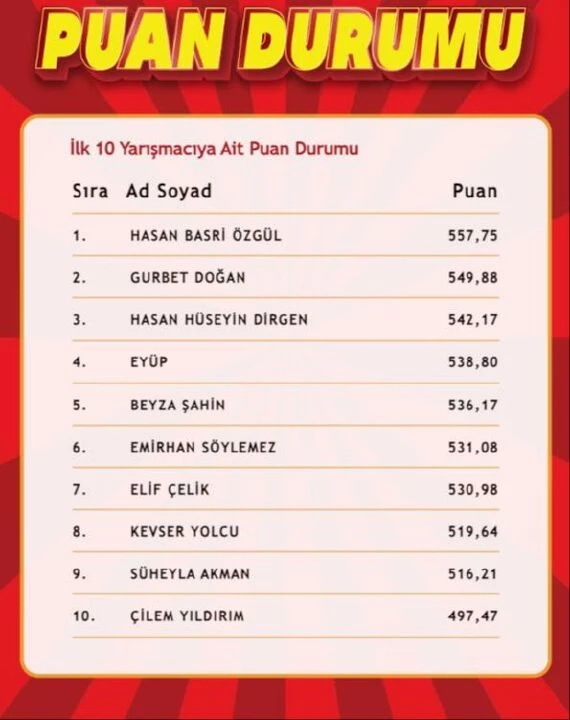 ” programına katılan yarışmacılar arasında birinci olan ve ilk on sıraya giren isimlerin listesiyle birlikte cevap anahtarları da  tgrthaber.com ve sosyal medya hesaplarımızdan paylaşılıyor.
