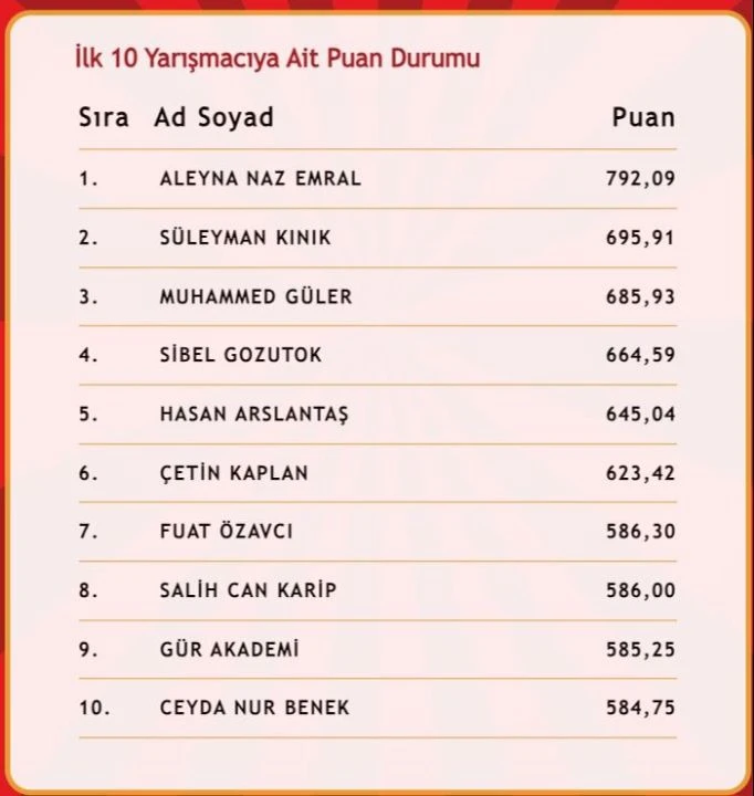 “Çözen Kazanır” programına katılan yarışmacılar arasında birinci olan ve ilk on sıraya giren isimlerin listesiyle birlikte cevap anahtarları saat 21.30’da tgrthaber.com ve sosyal medya hesaplarımızdan paylaşılıyor.