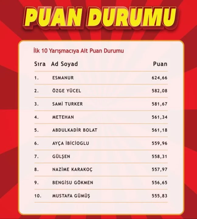“Çözen Kazanır” programına katılan yarışmacılar arasında birinci olan ve ilk on sıraya giren isimlerin listesiyle birlikte cevap anahtarları saat 21.30’da tgrthaber.com ve sosyal medya hesaplarımızdan paylaşılıyor.