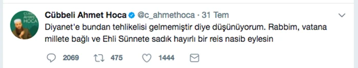 Diyanet İşleri Başkanlığı görevinden emekli edilen Mehmet Görmez, görevini Ekrem Keleş’e devretti. Bunun üzerine “Cübbeli Ahmet Hoca” olarak bilinen Ahmet Mahmut Ünlü sosyal medya hesaplarından paylaşımda bulundu: