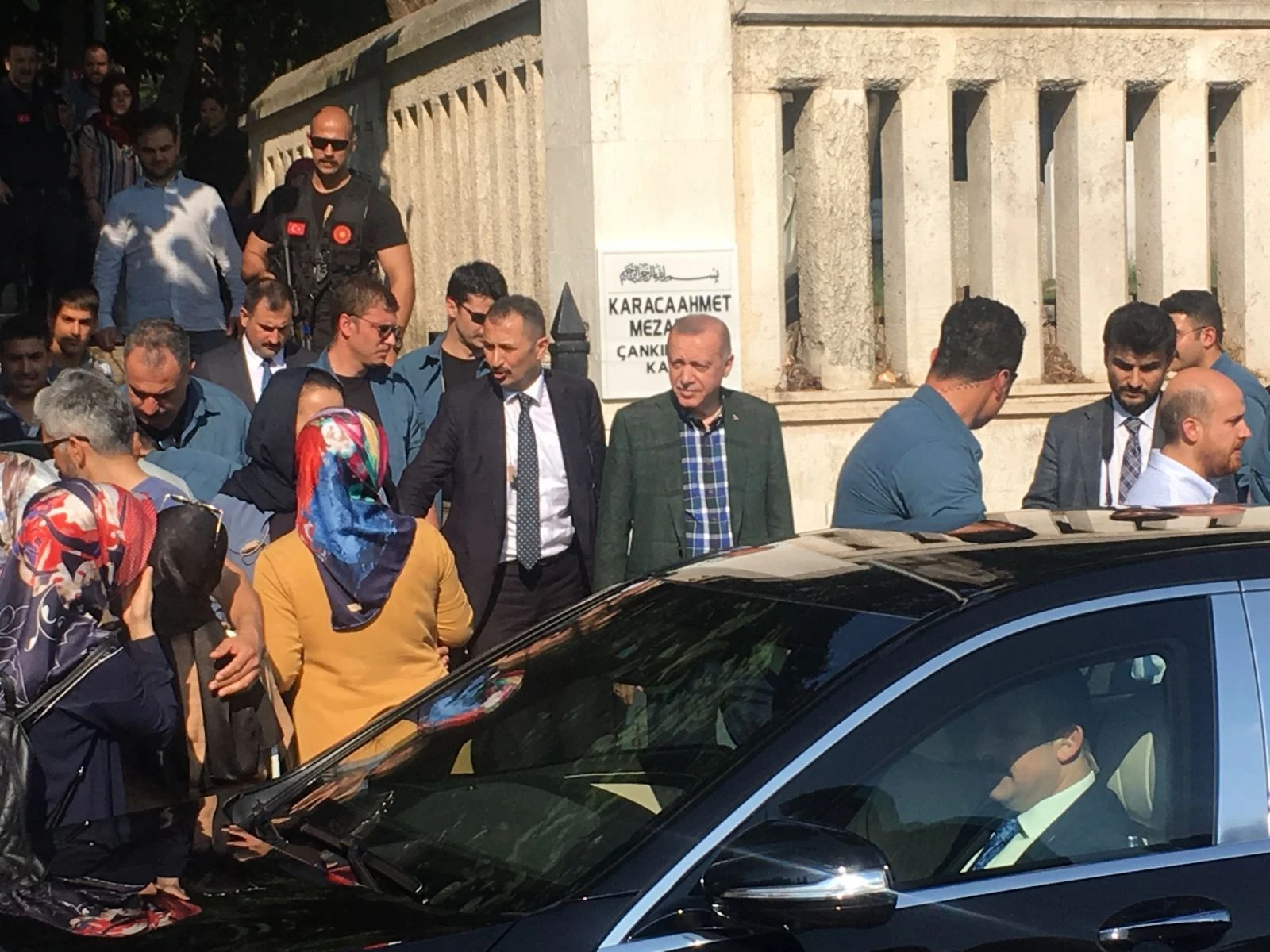 Ramazan Bayramı'nı İstanbul'da geçiren Cumhurbaşkanı Erdoğan, Üsküdar Kısıklı'daki konutundan Karacaahmet Mezarlığı'na geldi. Oğlu Bilal Erdoğan ile birlikte annesi Tenzile ve babası Ahmet Erdoğan'ın mezarlarını ziyaret eden Erdoğan, mezarlıktan ayrılırken kendisini bekleyen vatandaşlarla bayramlaşarak bir süre sohbet etti.
