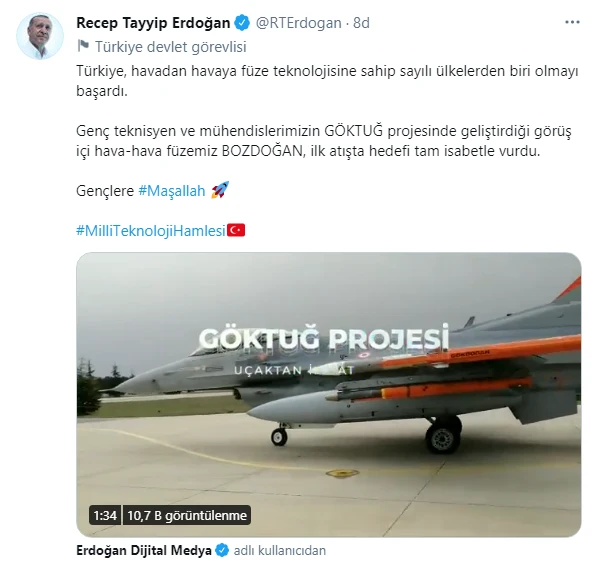 "Türkiye, havadan havaya füze teknolojisine sahip sayılı ülkelerden biri olmayı başardı. Genç teknisyen ve mühendislerimizin GÖKTUĞ Projesinde geliştirdiği görüş içi hava-hava füzemiz BOZDOĞAN ilk atışta hedefi tam isabetle vurdu.”