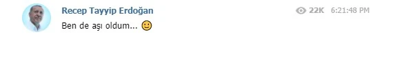 Cumhurbaşkanı Recep Tayyip Erdoğan, Telegram ve Bip üzerinden, "Ben de aşı oldum" paylaşımı yaptı.