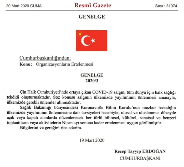 "Ulusal ve uluslararası düzeyde açık veya kapalı alanlarda düzenlenecek her türlü, bilimsel, kültürel, sanatsal ve benzeri toplantıların veya aktivitelerin nisan ayı sonuna kadar ertelenmesi uygun görülmüştür."