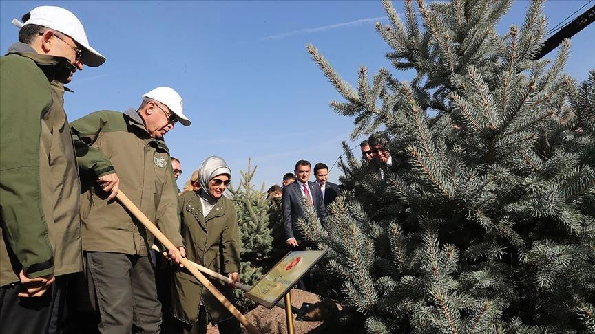 17 yılda toplam 4,5 milyar fidanı toprakla buluşturarak orman varlığını 20,8 milyon hektardan 22,6 milyon hektara çıkardıklarını belirten Erdoğan, "Bizim yeşil sevgimizi, ağaç hassasiyetimizi, çevre hassasiyetimizi kimsenin terazisi ölçmeye yetmez." diye konuştu.