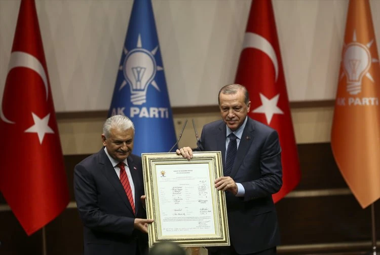 "Özlemek sabretmektir, yılları, ayları saatleri izlemektir. Gelecekse beklenen, beklemek güzel. İşte beklenen an sayın Cumhurbaşkanımız, kurucu genel başkanımız bugün yuvaya, kurucusu olduğu AK Parti'ye tekrar dönüyor. Kendisine yol arkadaşlarım adına, bütün parti teşkilatım, grubum adına hoşgeldiniz, şeref verdiniz diyorum. Bize bu yolu açan aziz milletime huzurlarınızda şükranlarımı sunuyorum. Sayın Cumhurbaşkanım, saygıdeğer hanımefendi, değerli yol arkadaşlarım hepinizi saygıyla, hürmetle selamlıyorum. Konuşmamın başında geçtiğimiz Cuma günü kesin sonuçların açıklandığı 16 Nisan halkoylamasının demokrasimize, ülkemize tekrar hayırlı, uğurlu olmasını Cenab-ı Mevlamdan niyaz ediyorum. 16 Nisan 2017 Türkiye'nin siyasi tarihinde Cumhuriyet'in ilanı kadar, çok partili hayata geçiş kadar iftiharla hatırlanacak son derece anlamlı bir gündür. Bu günü anlamlı kılan aziz milletimizin iradesiyle, istikrarı, güçlü iktidarı, demokrasiyi ve uzlaşmayı kurumsal hale getirmiş olmasıdır. Bunun için büyük bir kararlılıkla sandığa giden milletimizin her bir ferdine şükranlarımı sunuyorum. Bu vesile ile bugüne kadar ülkemizin kalkınması, büyümesi, gelişmesi yolunda hizmeti geçen, demokrasi mücadelemize katkı sağlayan herkese bir kez daha teşekkür ediyorum, onları hayırla yadediyorum.