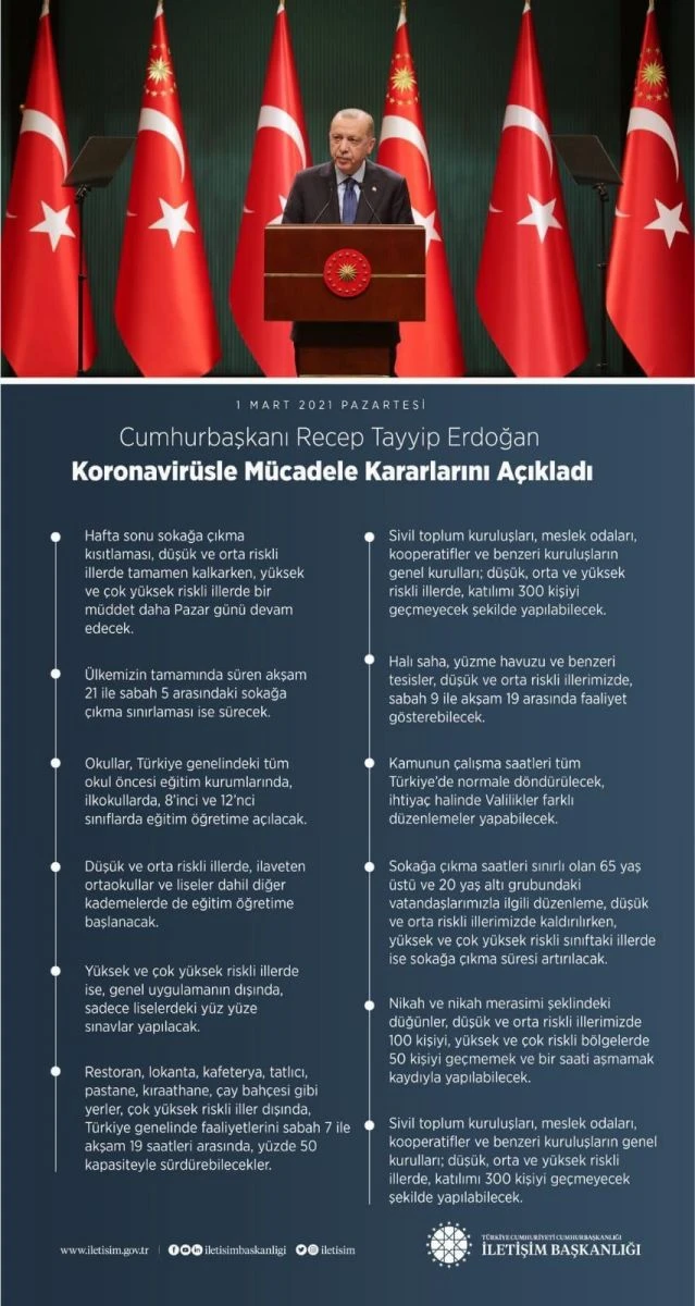 Türkiye Cumhurbaşkanı Recep Tayyip Erdoğan, Cumhurbaşkanlığı Kabine Toplantısının ardından basın toplantısı düzenledi. "Bu çerçevede, milletimize daha önce söz verdiğimiz şekilde, bugün itibariyle yeni “KONTROLLÜ NORMALLEŞME” sürecini başlatıyoruz." diyen Cumhurbaşkanı Erdoğan, kontrollü normalleşme ile atılacak adımları şu şekilde açıkladı: