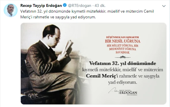 Paylaşımda, Cemil Meriç'in fotoğrafı ve "Düşünmek savaşmaktır. Bir nesil uğruna, bir millet uğruna, bir medeniyet uğruna savaşmak." ifadeleriyle Cumhurbaşkanı Erdoğan'ın "Vefatının 32. yıl dönümünde kıymetli mütefekkir, müellif ve mütercim Cemil Meriç'i rahmetle ve saygıyla yad ediyorum." ifadesi yer aldı.
