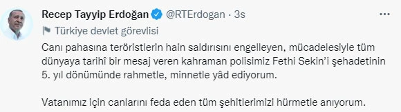 Erdoğan mesajında şu ifadeleri kullandı: "Canı pahasına teröristlerin hain saldırısını engelleyen, mücadelesiyle tüm dünyaya tarihî bir mesaj veren kahraman polisimiz Fethi Sekin’i şehadetinin 5. yıl dönümünde rahmetle, minnetle yâd ediyorum. Vatanımız için canlarını feda eden tüm şehitlerimizi hürmetle anıyorum."