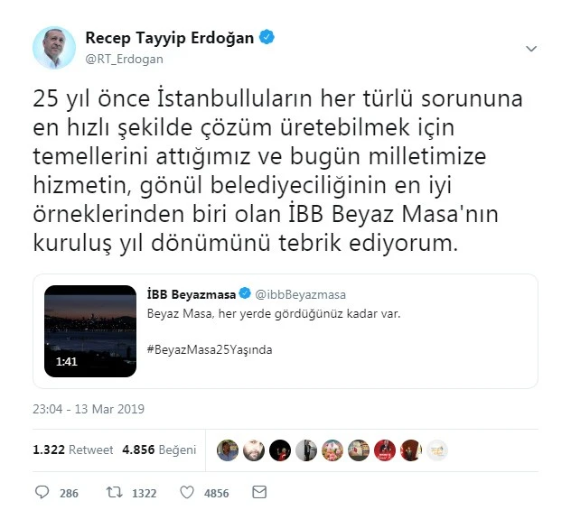 Cumhurbaşkanı Recep Tayyip Erdoğan da İBB Beyaz Masa’nın 25'inci yılını, “25 yıl önce İstanbulluların her türlü sorununa en hızlı şekilde çözüm üretebilmek için temellerini attığımız ve bugün milletimize hizmetin, gönül belediyeciliğinin en iyi örneklerinden biri olan İBB Beyaz Masa'nın kuruluş yıl dönümünü tebrik ediyorum” mesajıyla Twitter hesabından kutladı.