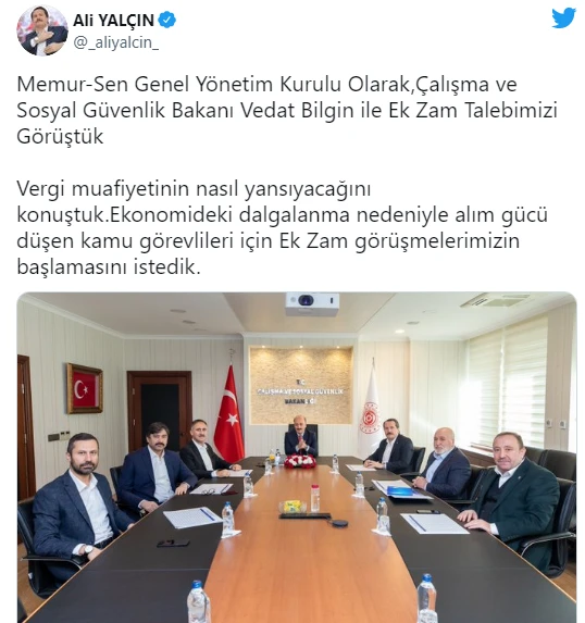 Öte yandan, dün Türkiye Kamu-Sen Genel Başkanı Önder Kahveci ve beraberindeki heyet, Çalışma ve Sosyal Güvenlik Bakanı Vedat Bilgin'i ziyaret etmişti. Görüşme sonrası açıklamalarda bulunan Önder Kahveci, "Çalışma ve Sosyal Güvenlik Bakanı Sayın Vedat Bilgin'i makamında ziyaret ederek, çalışma hayatının sorunları, ek zam, refah payı, 3600 ek gösterge, vergi muafiyeti gibi konulardaki görüşlerimizi bir kez daha kendisine ilettik" ifadeleri kullandı.