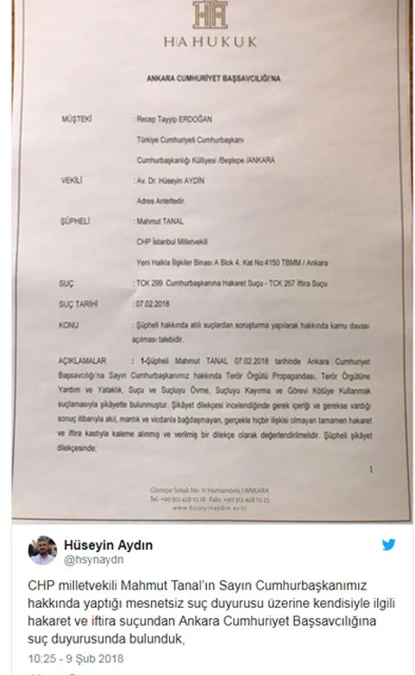 Cumhurbaşkanı Recep Tayyip Erdoğan'ın avukatı Hüseyin Aydın, CHP Milletvekili Mahmut Tanal hakkında iftira ve hakaret suçlarından Ankara Cumhuriyet Başsavcılığı'na suç duyurusunda bulunduklarını açıkladı.
