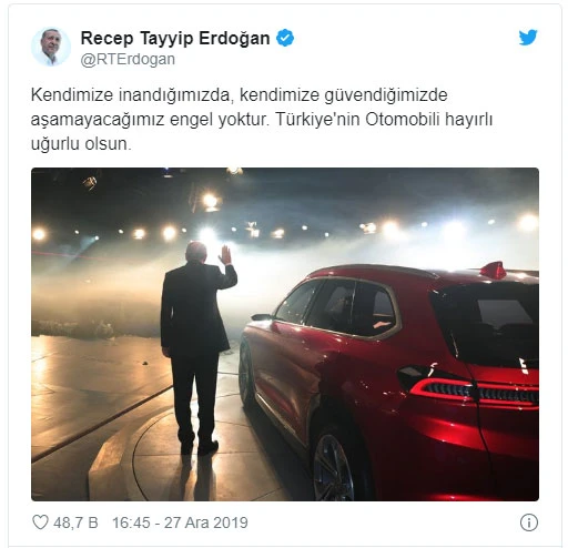 Cumhurbaşkanı Erdoğan, Gebze'de gerçekleşen "Bilişim Vadisi"nin resmi açılış töreni ile yerli otomobilin tanıtıldığı "Türkiye'nin Otomobili Girişim Grubu Yeniliğe Yolculuk Buluşması" programının ardından, Twitter hesabından yerli otomobile ilişkin paylaşımda bulundu.